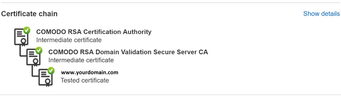 Here’s an example of a complete chain, note that in this case 2 intermediate certificates have been supplied.